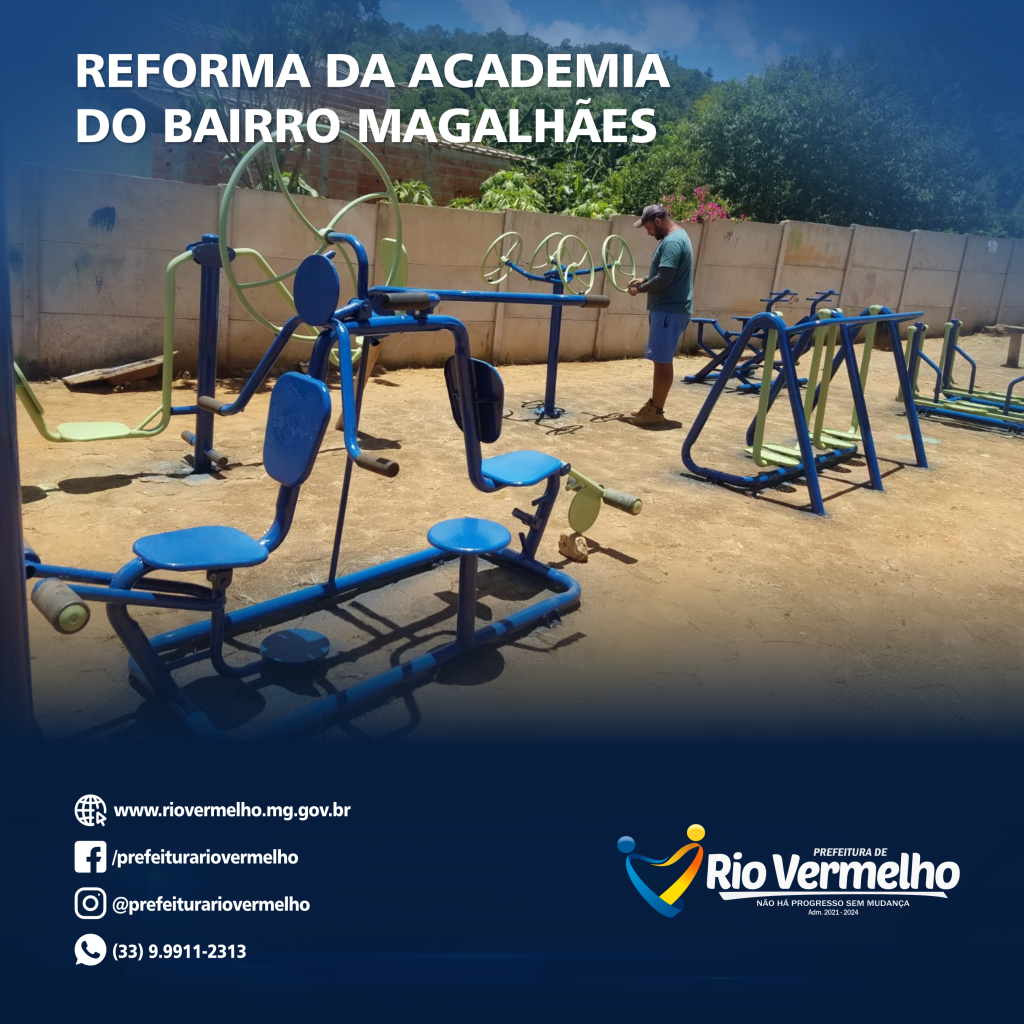 A Prefeitura de Rio Vermelho, através da Divisão de Esportes do município, realizou manutenção dos aparelhos da “Academia da Cidade”, instalada na praça do bairro Magalhães. A manutenção se faz necessária, uma vez que os aparelhos ficam expostos ao tempo e são utilizados por pessoas de todas as idades.