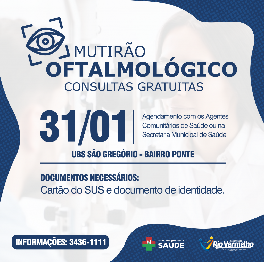 Mutirão de Consultas Oftalmológicas na Estratégia Saúde da Família São Gregório no Bairro Ponte. Dia 31/01/2022 das 8h às 18h. As fichas deverão ser agendadas com o seu Agente Comunitário de Saúde ou na Secretaria Municipal de Saúde. Secretaria Municipal de Saúde Prefeitura Municipal de Rio Vermelho Adm: 2021-2024