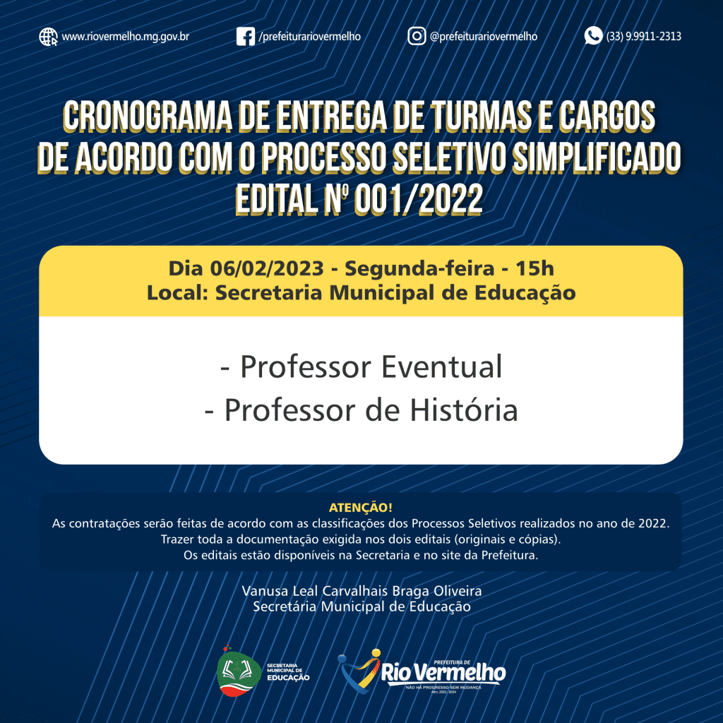 CRONOGRAMA DE ENTREGA DE TURMAS E CARGOS DE ACORDO COM O PROCESSO SELETIVO Nº 001/2022 – SECRETARIA DE EDUCAÇÃO