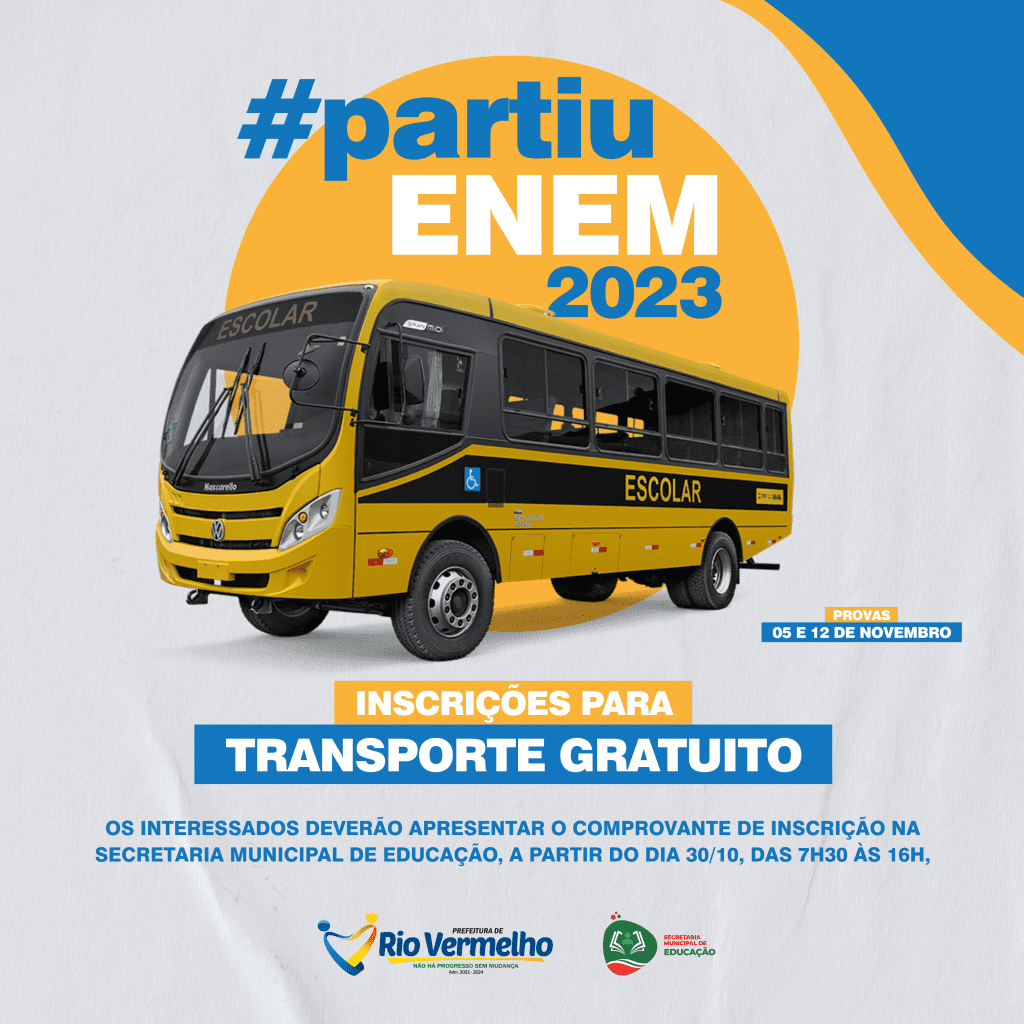 Vai fazer o ENEM 2023? Então inscreva-se para o transporte gratuito que será disponibilizado pela Prefeitura Municipal de Rio Vermelho, através da Secretaria Municipal de Educação. A partir do dia 30/10, compareça à Secretaria de Educação com o seu comprovante de inscrição do ENEM.