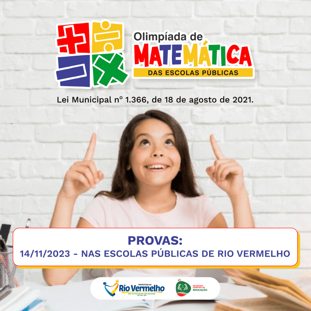 Vem aí a Olimpíada de Matemática das Escolas Públicas de Rio Vermelho, de acordo com a Lei Municipal nº 1.366, de 18 de agosto de 2021. As provas serão realizadas nas escolas públicas do município, no dia 14 de novembro de 2023.