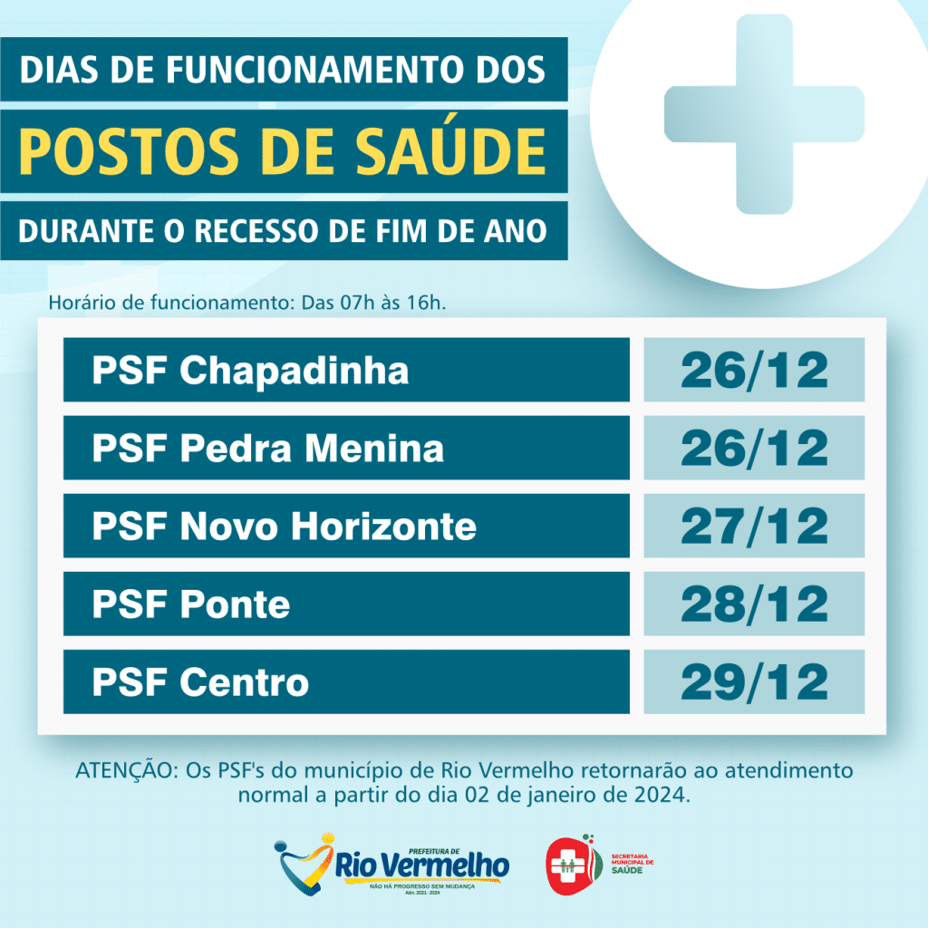 CONFIRA OS DIAS DE FUNCIONAMENTO DOS PSF’S DURANTE O RECESSO DE FIM DE ANO