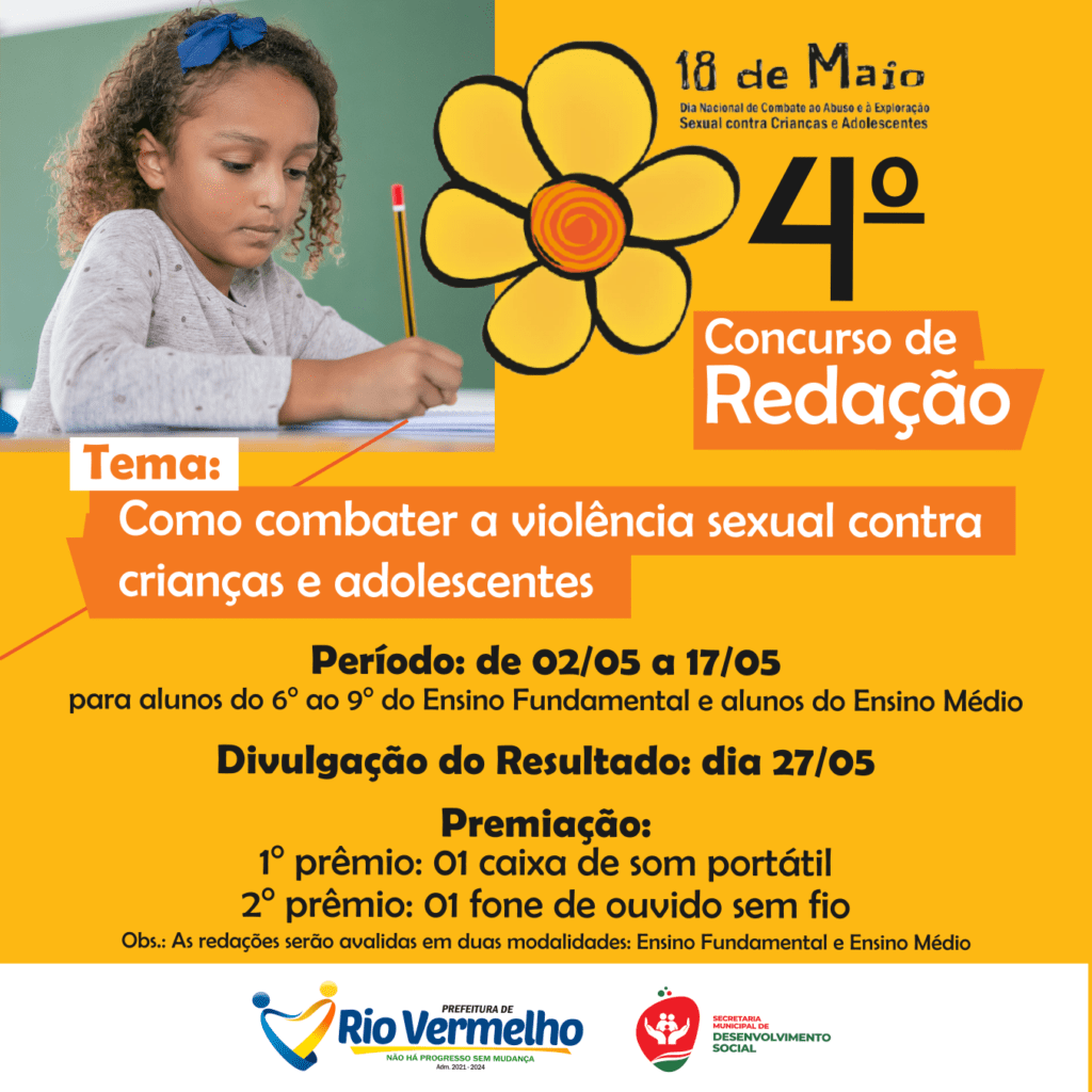 Maio é o mês de combate ao abuso e à exploração sexual contra crianças e adolescentes, e a Prefeitura de Rio Vermelho, por meio da Secretaria Municipal de Desenvolvimento Social está realizando a 4ª edição do Concurso de Redação a respeito desta campanha. Tema: Como combater a violência sexual contra crianças e adolescentes Período: De […]
