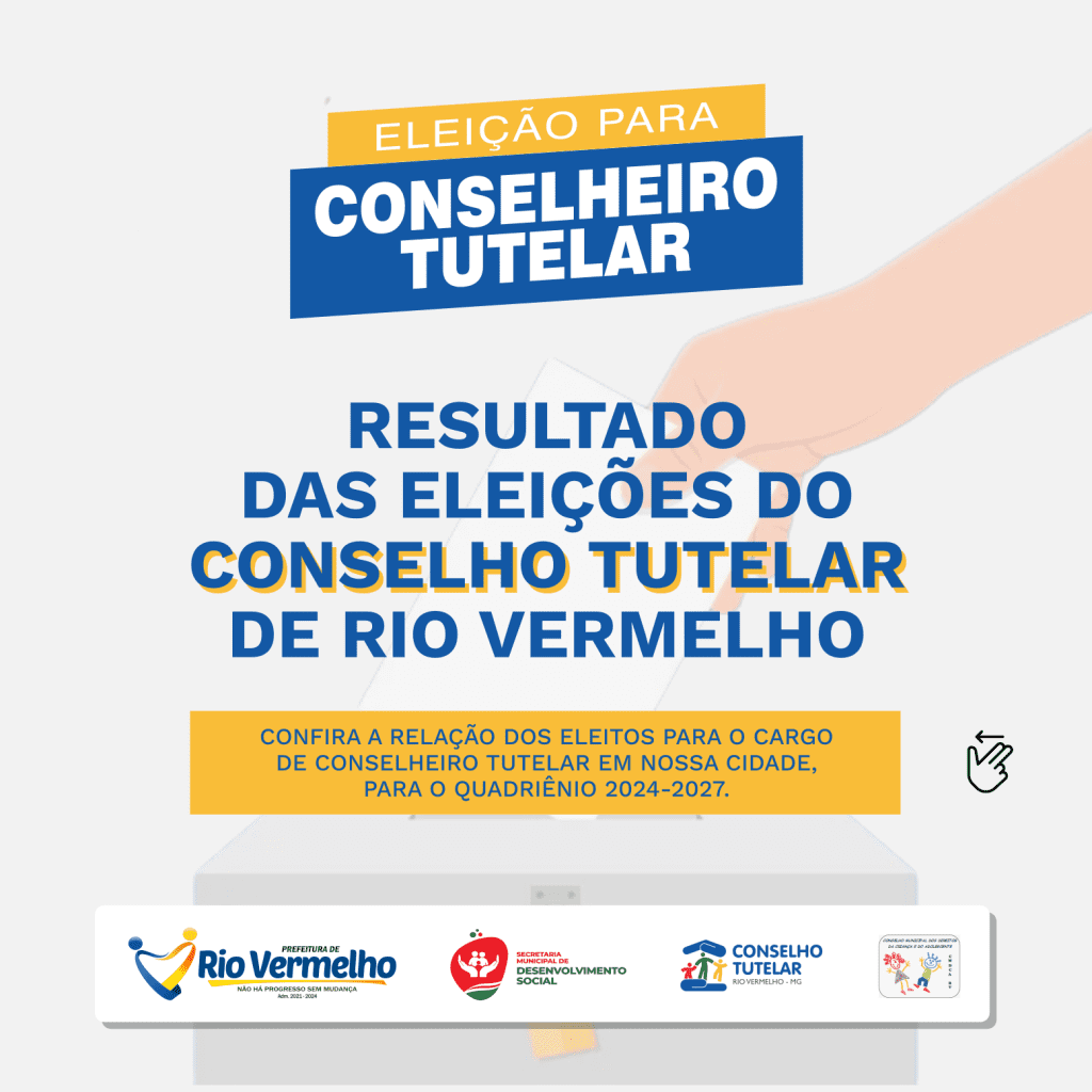 O Conselho Municipal dos Direitos da Criança e do Adolescente e Comissão Eleitoral tornam público o resultado da eleição unificada dos membros titulares e suplentes do Conselho Tutelar do município de Rio Vermelho-MG, realizada no dia 01 de outubro de 2023.