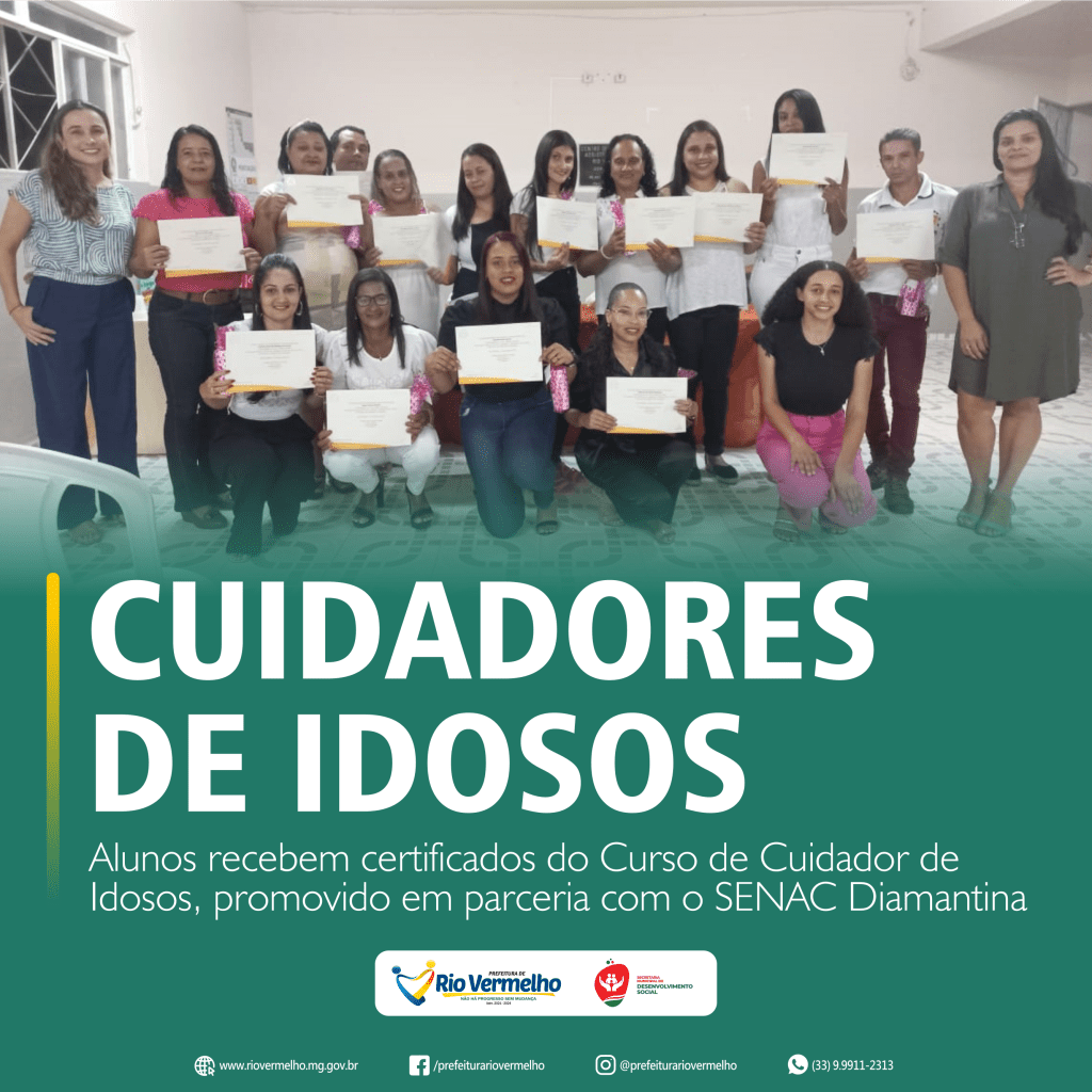 A Prefeitura Municipal de Rio Vermelho, através do CRAS (Centro de Referência de Assistência Social), em parceria com o SENAC Diamantina, realizou o curso de Cuidador de Idosos. No dia 28 de março, os alunos receberam o certificado de conclusão do curso. A Secretaria Municipal de Desenvolvimento Social está sempre em busca de parcerias que […]