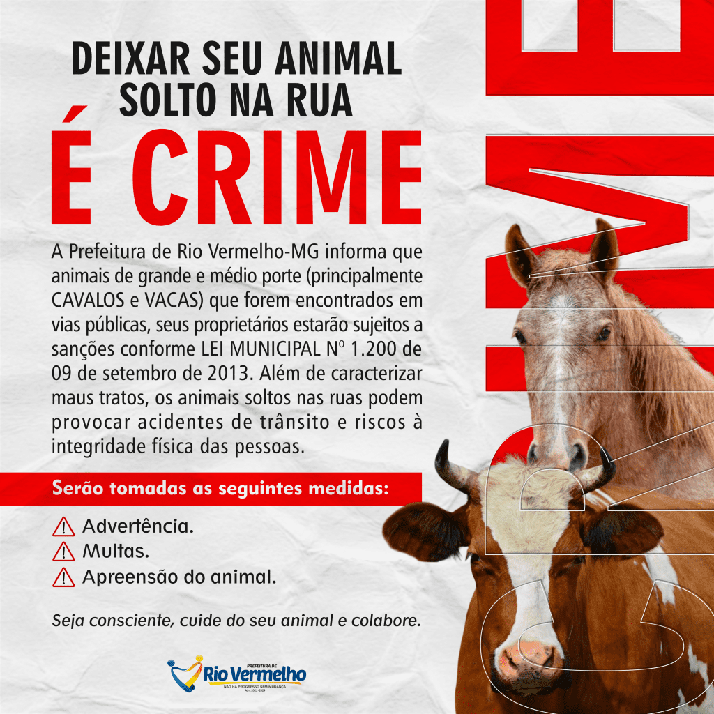 A Prefeitura Municipal de Rio Vermelho informa que, deixar qualquer animal de pequeno, médio ou grande porte, solto nas vias e logradouros públicos é crime, causa acidente de trânsito e coloca vidas em risco! Os proprietários destes animais poderão sofrer punições de acordo com o Código de Posturas do Município. Mantenha a cidade protegida, evite […]