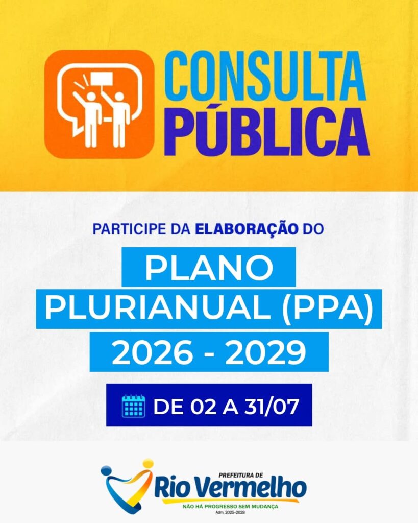 PARTICIPAR AGORA A Prefeitura Municipal de Rio Vermelho, com objetivo o despertar na sociedade civil o interesse para o acompanhamento do Orçamento Público, convida você para participação na consulta pública para elaboração na elaboração do PPA (2026-2029). Previous Next + – Download PDF Print PDF Formulário Eletrônico (PPA)– 2026-2029 PARTICIPAR AGORA A Prefeitura Municipal de […]