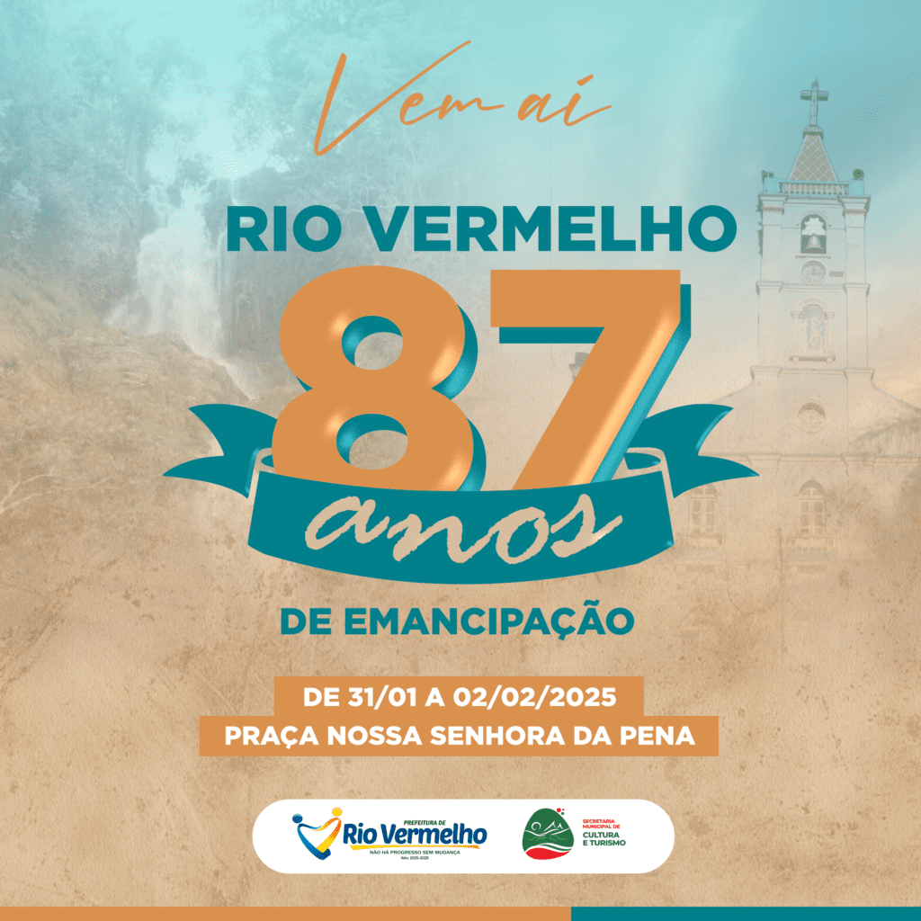 31 de janeiro de 2024: 86º Aniversário de Emancipação Político-administrativa de Rio Vermelho. Nesta data tão importante para todos nós, rio-vermelhenses, a Prefeitura Municipal homenageia nosso povo, nossa cultura, nossa história. Parabéns, Rio Vermelho! Parabéns a todos os rio-vermelhenses!!! Administração 2021-2024 – Pra frente é que se anda!