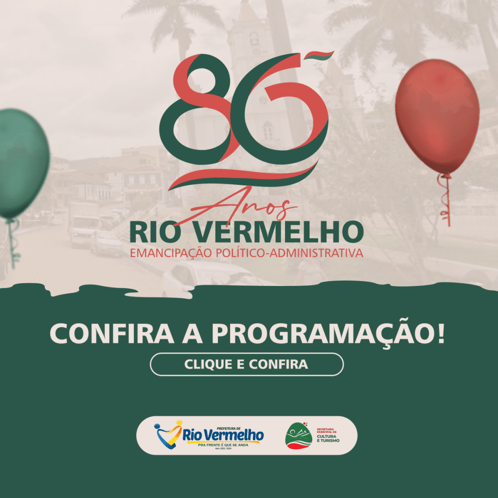 A Prefeitura Municipal, através da Secretaria Municipal de Cultura e Turismo, divulga a programação do 86º Aniversário de Emancipação Político-administrativa de Rio Vermelho. Você é o convidado especial. A festa é sua! Venha comemorar conosco! Prefeitura Municipal de Rio Vermelho (Adm: 2021-2024) Pra frente é que se anda!