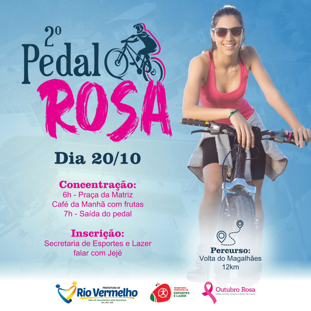 A Prefeitura Municipal de Rio Vermelho, por meio da Secretaria Municipal de Esportes e Lazer, convida a todos para o 2º Pedal Rosa, em alusão à Campanha Outubro Rosa, mês de conscientização e luta contra o câncer de mama. Sua participação será muito importante para reforçarmos a importância desta campanha.