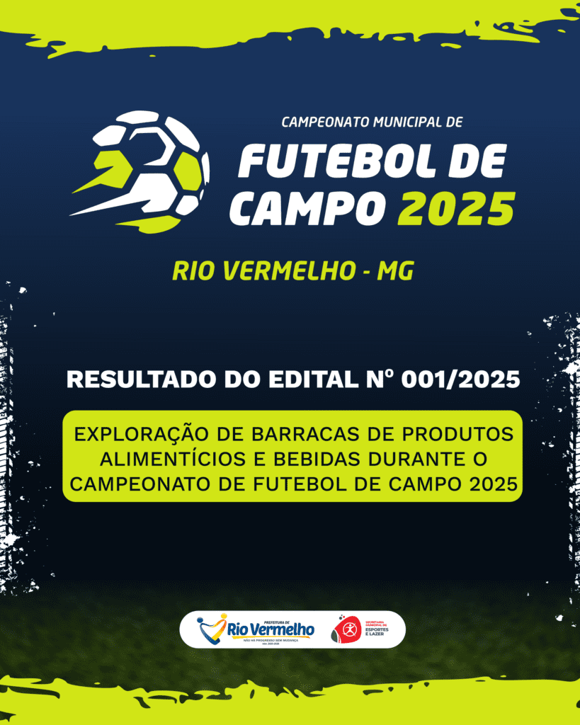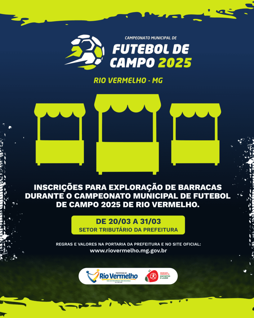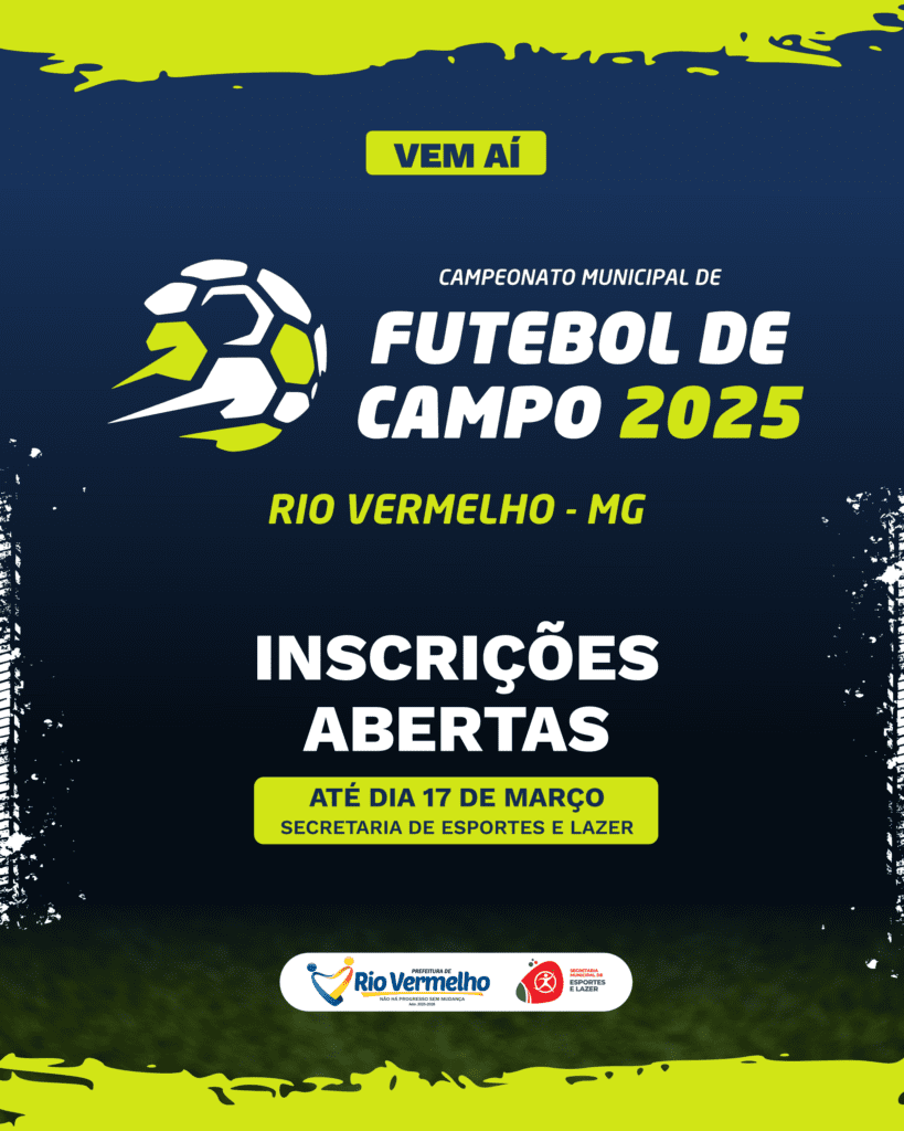 A Prefeitura de Rio Vermelho, por meio da Secretaria Municipal de Esportes e Lazer, abre inscrições para o XIX Campeonato Municipal de Futebol de Campo. As equipes deverão se inscrever até o dia 17 de março, na Secretaria Municipal de Esportes e Lazer, localizada na Rua João Antônio Carvalhais nº 318, ao lado do CRAS.