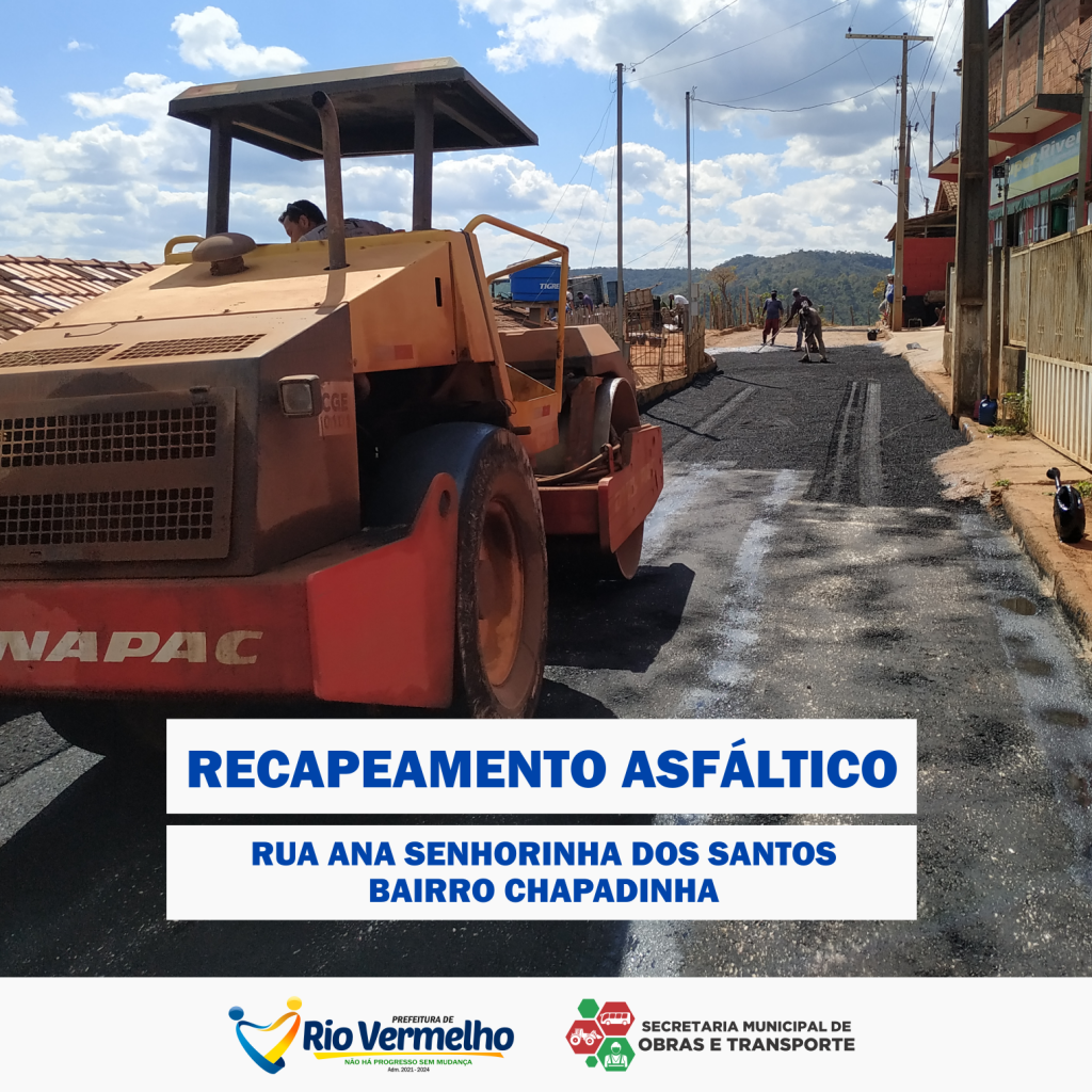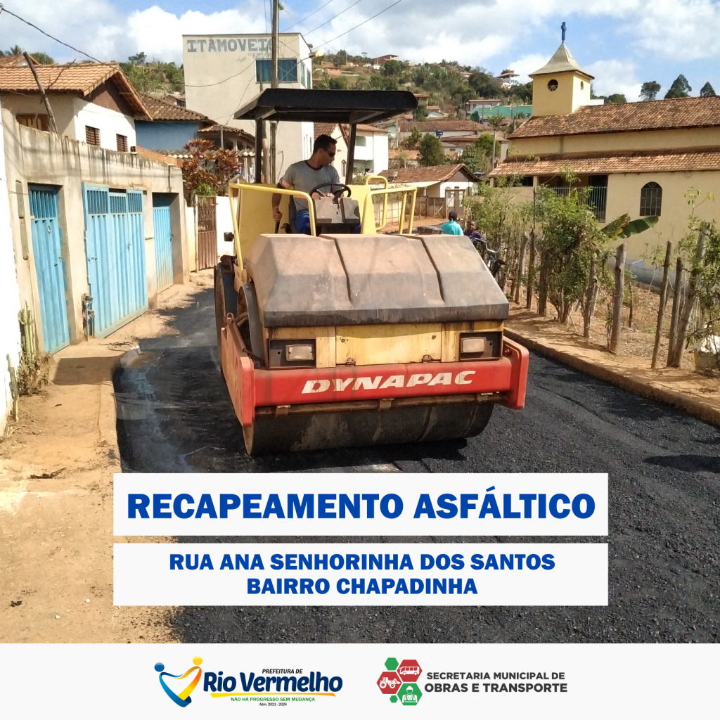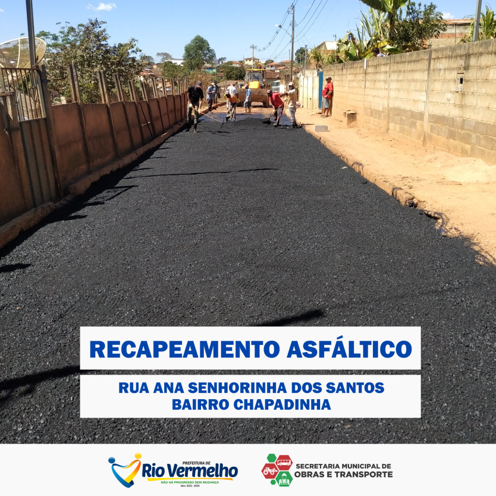 A Prefeitura de Rio Vermelho tem realizado o recapeamento asfáltico em diversas ruas da cidade, entre elas, uma das principais ruas do bairro Chapadinha, a Rua Ana Senhorinha dos Santos, que há muitos anos se encontrava em péssimas condições de tráfego, tanto para motoristas quanto para os pedestres.