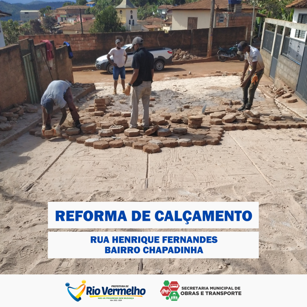 Durante esta semana, a Prefeitura de Rio Vermelho, por meio da Secretaria Municipal de Obras e Transporte, está realizando a reforma do calçamento da Rua Henrique Fernandes, no Bairro Chapadinha. O antigo calçamento está sendo totalmente refeito, após a retirada dos blocos e nivelamento da via.