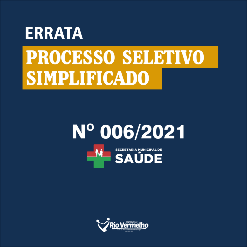ERRATA DO EDITAL DE PROCESSO SELETIVO SIMPLIFICADO EDITAL Nº 006/2021 – SEC. MUN. DE SAÚDEEDITAL DE PROCESSO SELETIVO SIMPLIFICADO EDITAL Nº 006/2021 – SEC. MUN. DE SAÚDE