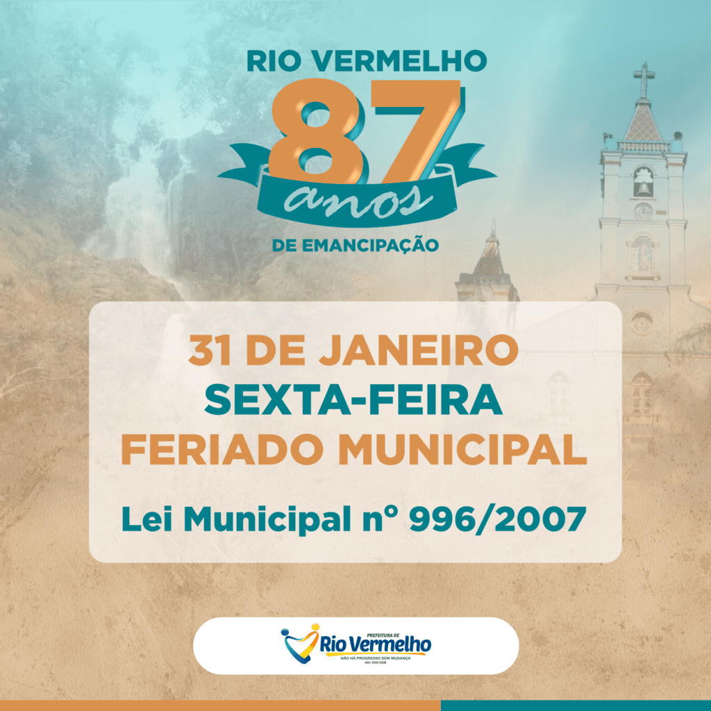 Em virtude do aniversário 87 anos de Emancipação Político-administrativa do município de Rio Vermelho, nesta sexta-feira, dia 31 de janeiro, é decretado Feriado Municipal, de acordo com a Lei Municipal nº 996, de 2007.A Prefeitura de Rio Vermelho comunica que nesta data não haverá atendimento nas repartições públicas municipais.