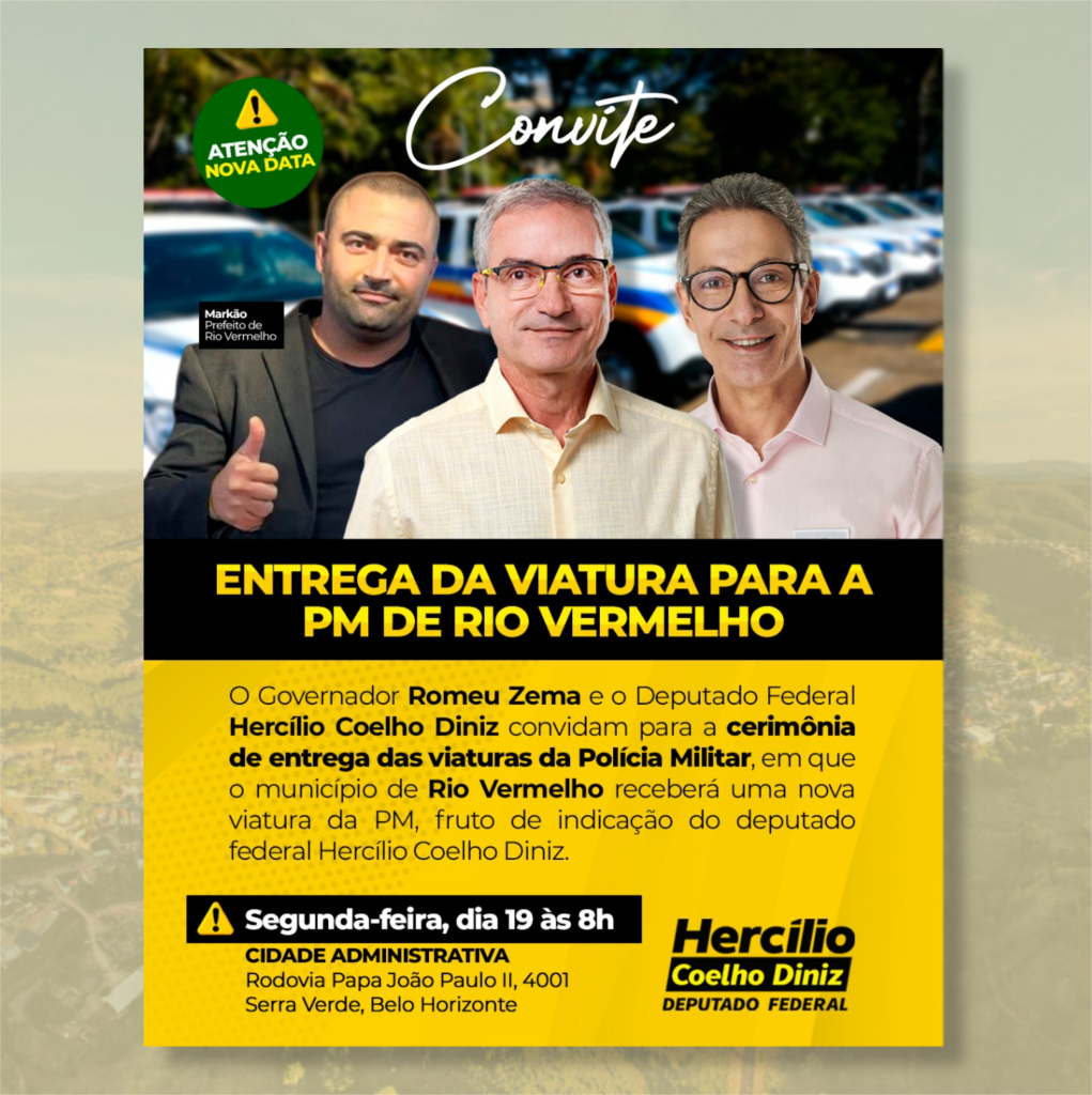 O Prefeito Markão receberá do Governador Romeu Zema uma nova viatura para a Polícia Militar de Rio Vermelho. O veículo destinado ao Município é uma indicação do deputado federal Hercílio Coelho Diniz e estará a serviço da população riovermelhense.
