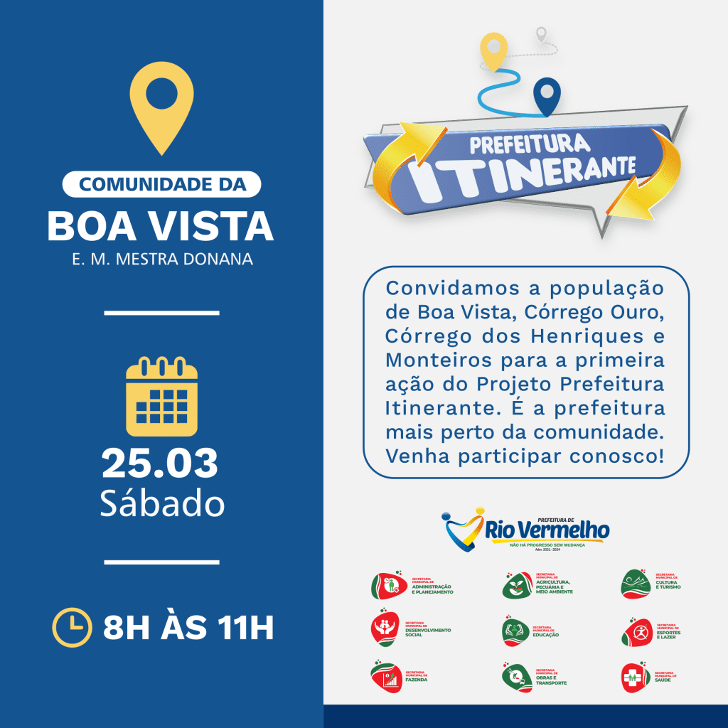 É com grande alegria que o Prefeito Markão anuncia o início do Projeto “Prefeitura Itinerante”, neste sábado, dia 25 de março de 2023, na comunidade da Boa Vista.